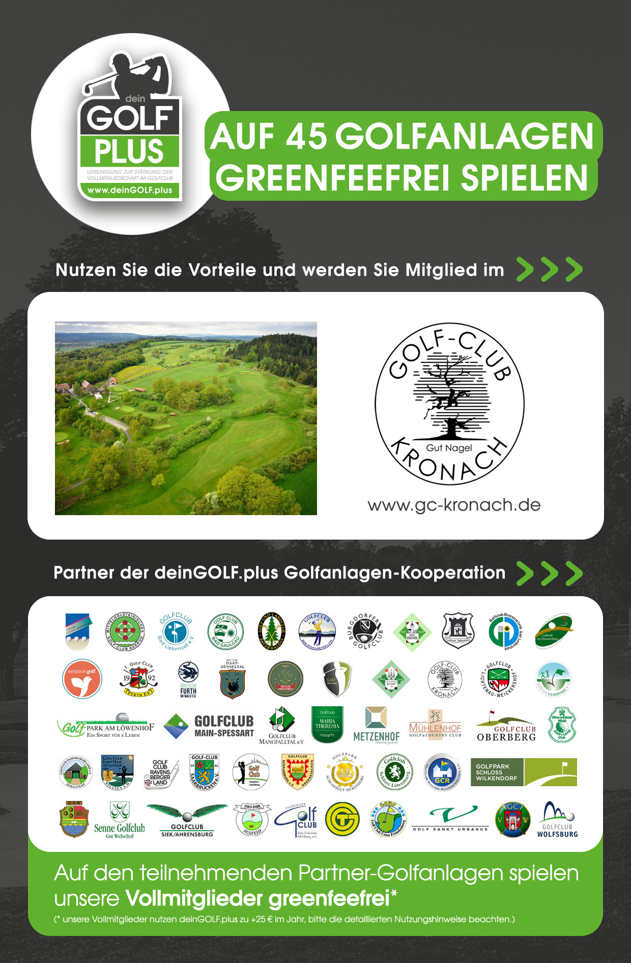 Der Golfclub Kronach ist Teil des „deinGOLF.plus“ Golfanlagen-Zusammenschlusses. Dieser hat sich zum Ziel gesetzt, die Vollmitgliedschaft der Mitglieder seiner Golfclubs zu stärken.